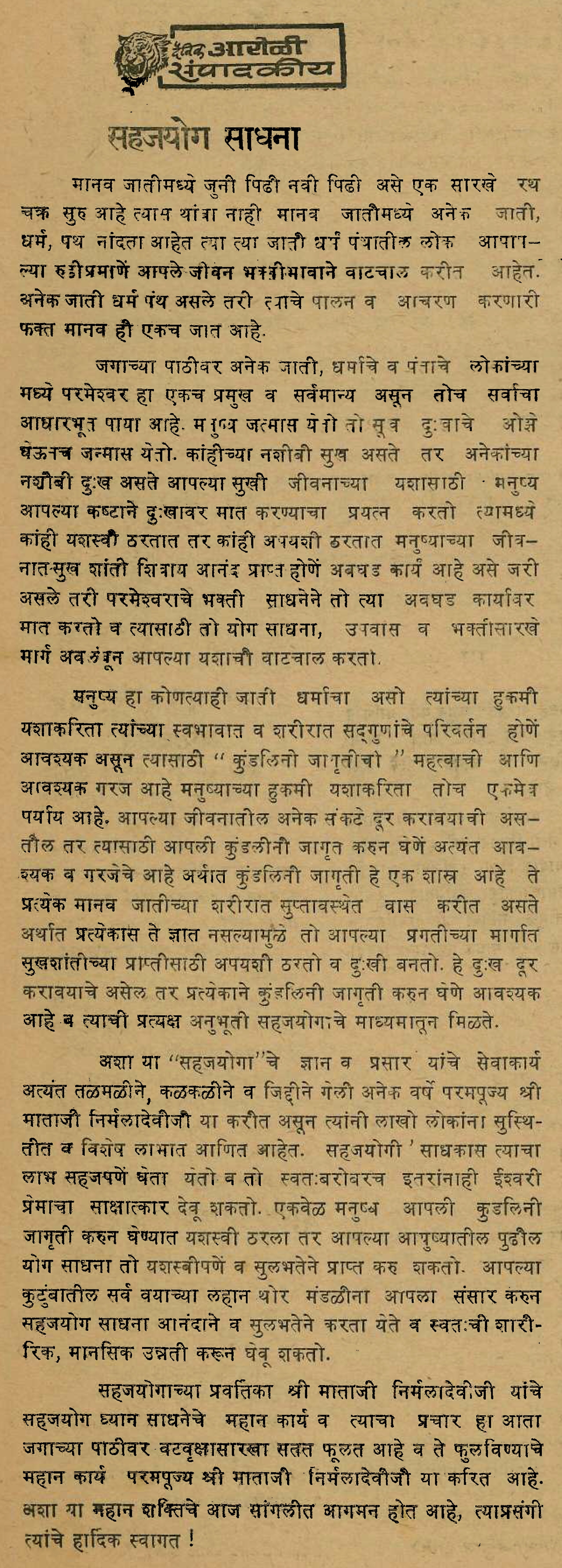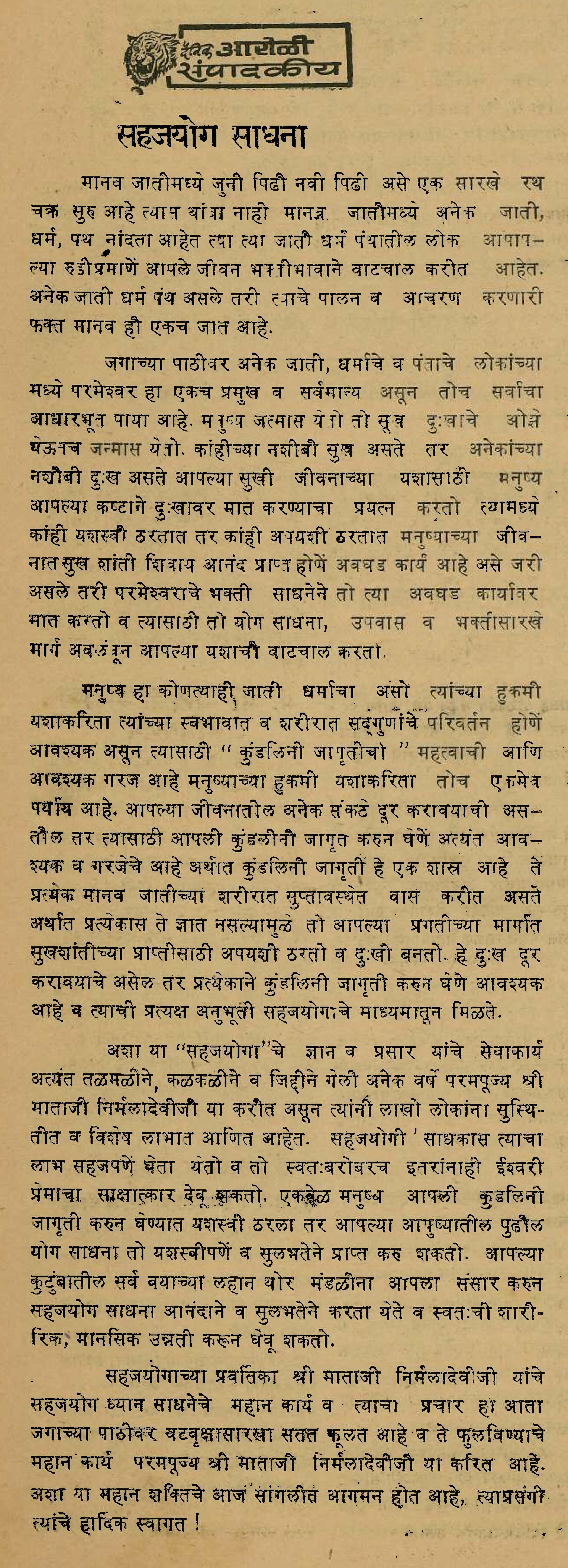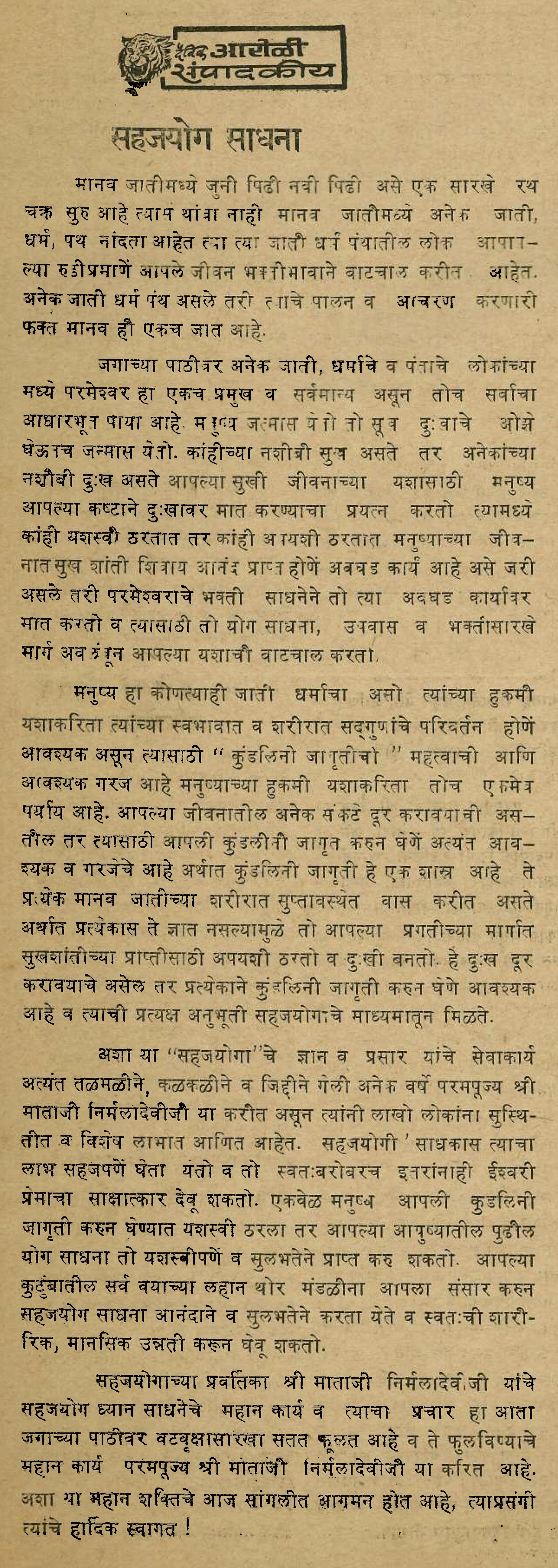 1986-1230 Article ‘Sahajayoga Sādhanā’ published in ‘Dainik Āroḷī’ (‘Daily Outcry’), Page 2, Column 1, Ajit Printing Press, Sangli, Maharashtra, India (Balwant Kumbhojkar Collection) (1 page, uploaded on 2025-1006)