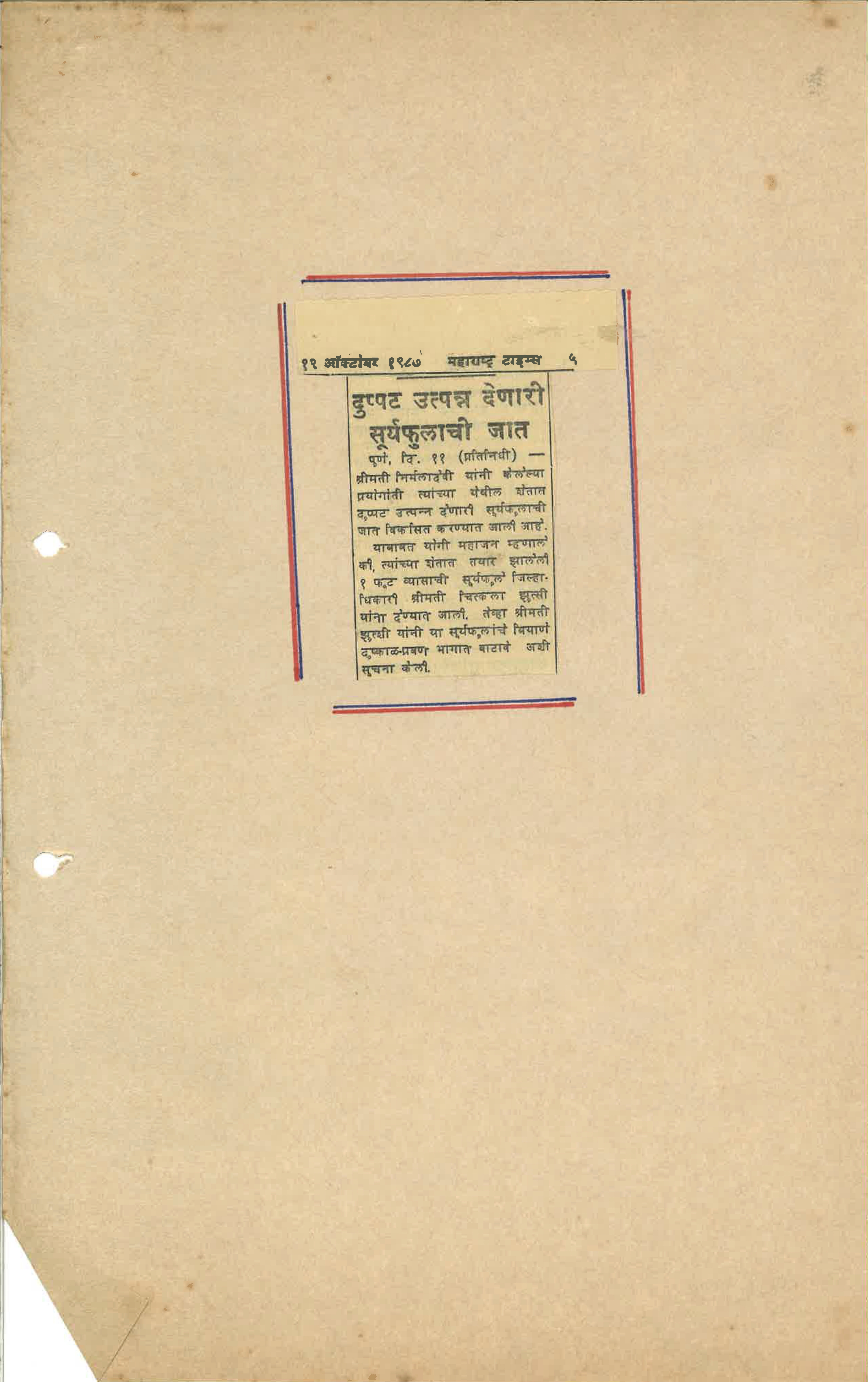 1987-1011 Article ‘Variety of sunflowers which gives double yield’ reported from Pune and published in ‘Maharashtra Times’ on 1987-1012, Maharashtra, India (Balwant Kumbhojkar Collection) (1 page, uploaded on 2025-1007)