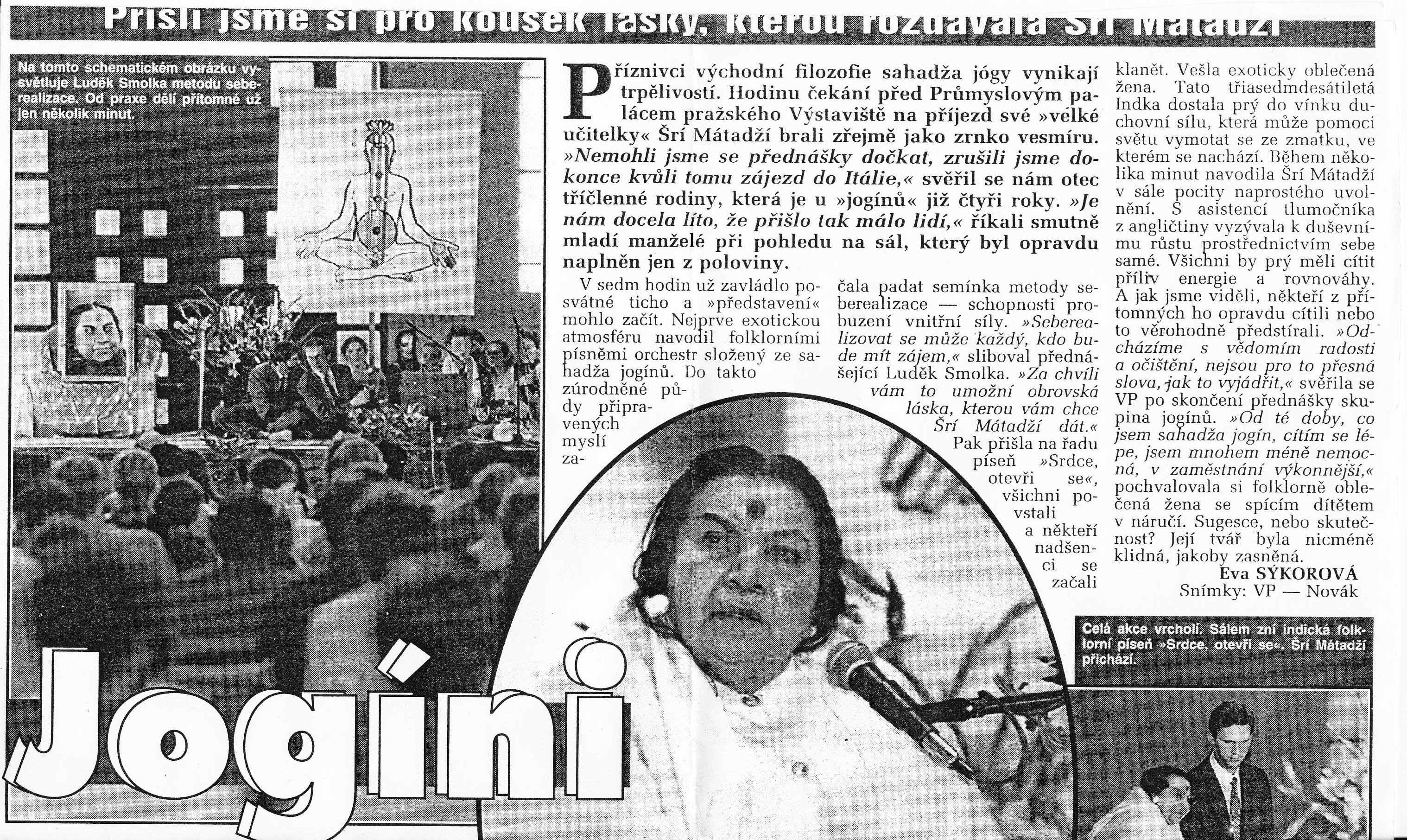 1995-0800 Article ‘Matka Nirmala Devi přijíždí do Prahy Jóga radosti a poznání’ (Mother Nirmala Devi arrives in Prague Yoga of joy and knowledge), Prague, Czech Republic (David Burša Collection) (1 page, uploaded on 2023-0518), Source: Šrí Mátadží v ČR 2