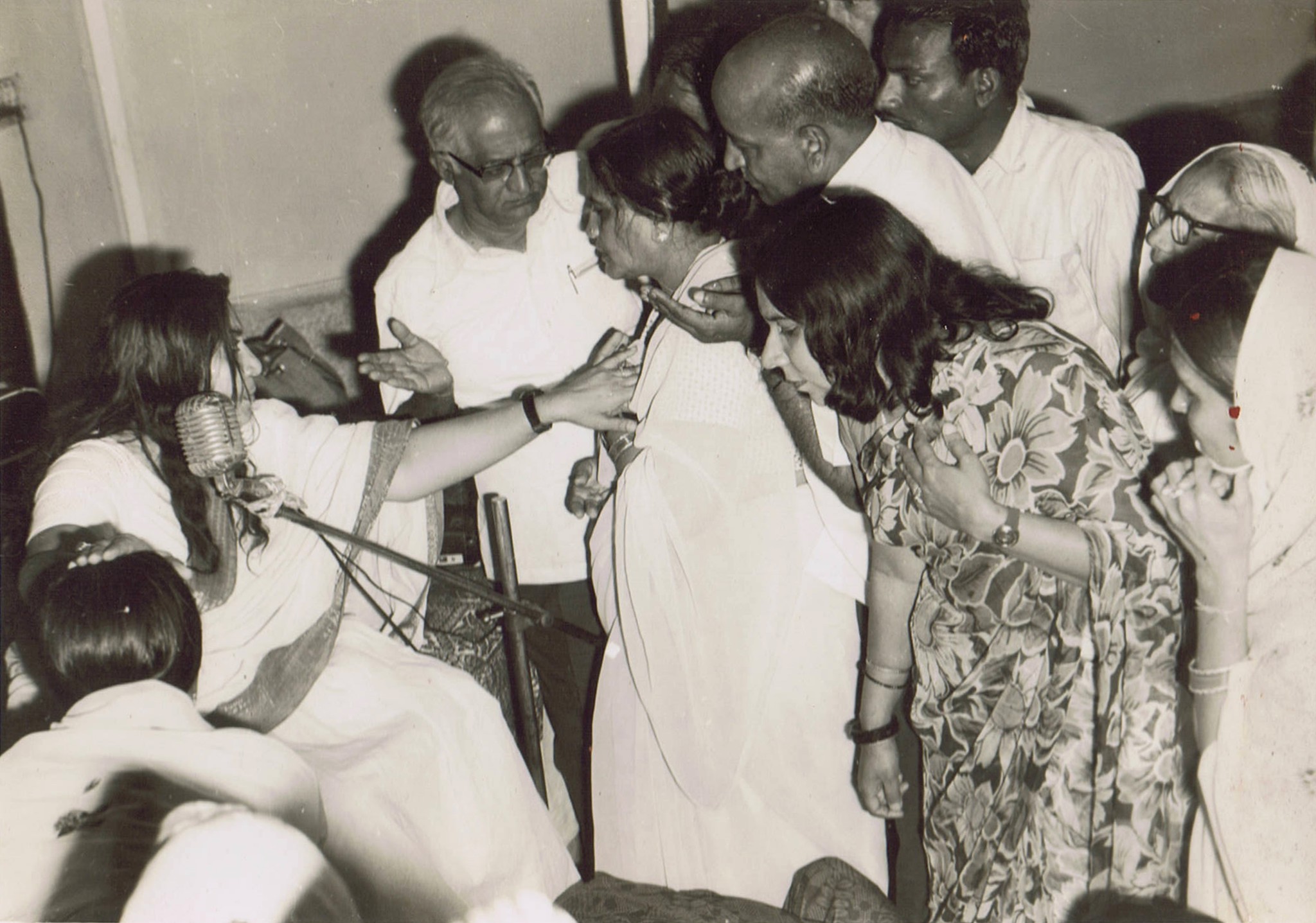 1904-0000 Public Program, India (workshop, touching with both hands, mike, seeker, Sahaja Yogi, wall, right view)