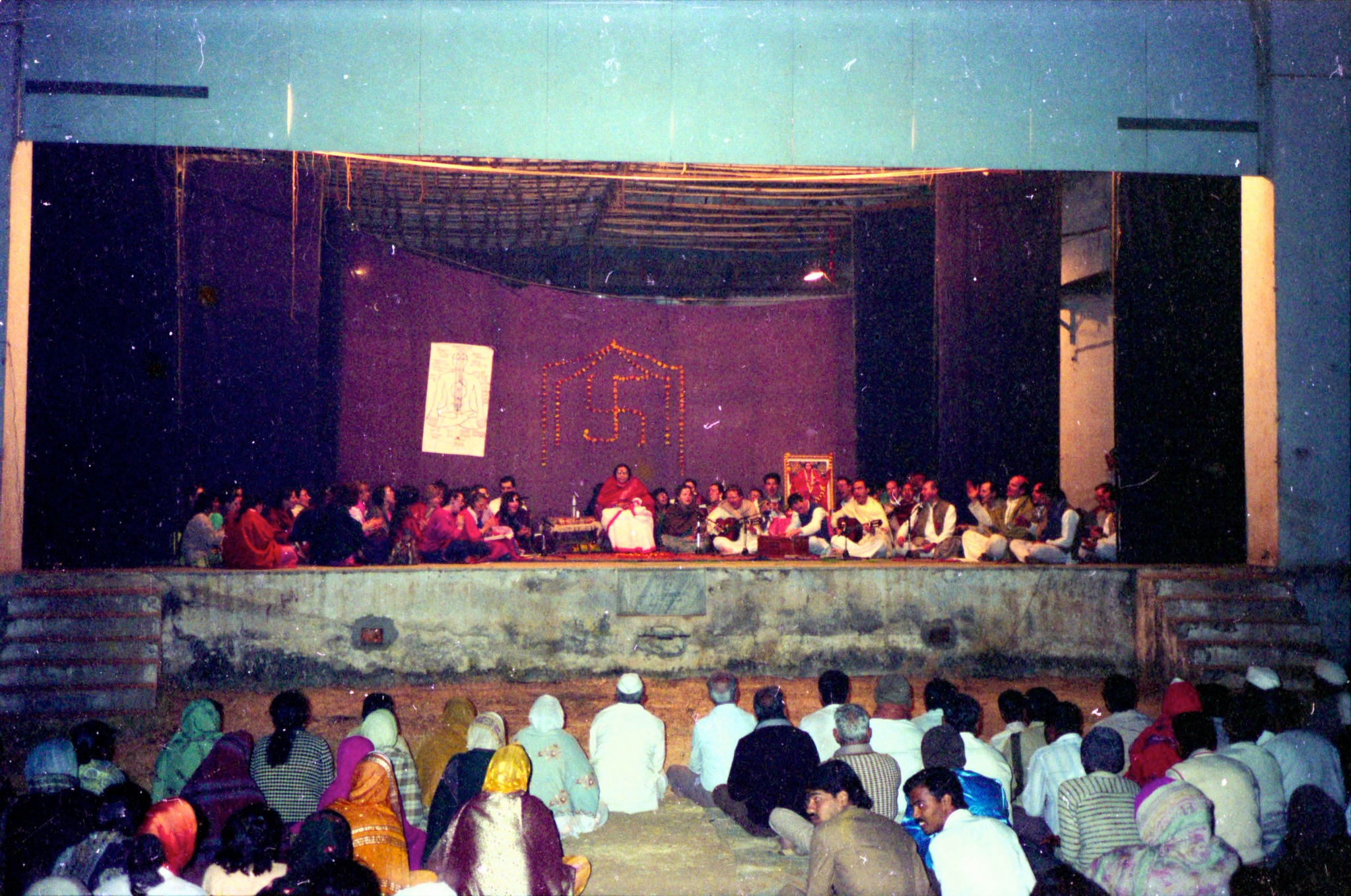 1904-0000 Public Program, Amphitheater, India (white sāṛī with red border, red shawl, Chakra Chart, Photo, Western musicians)