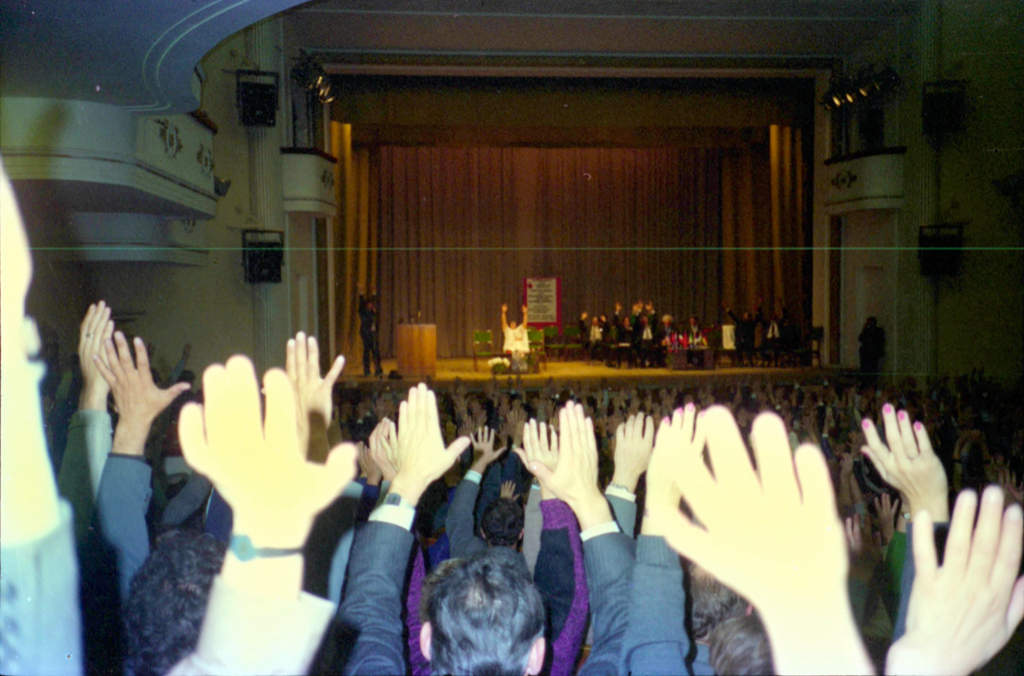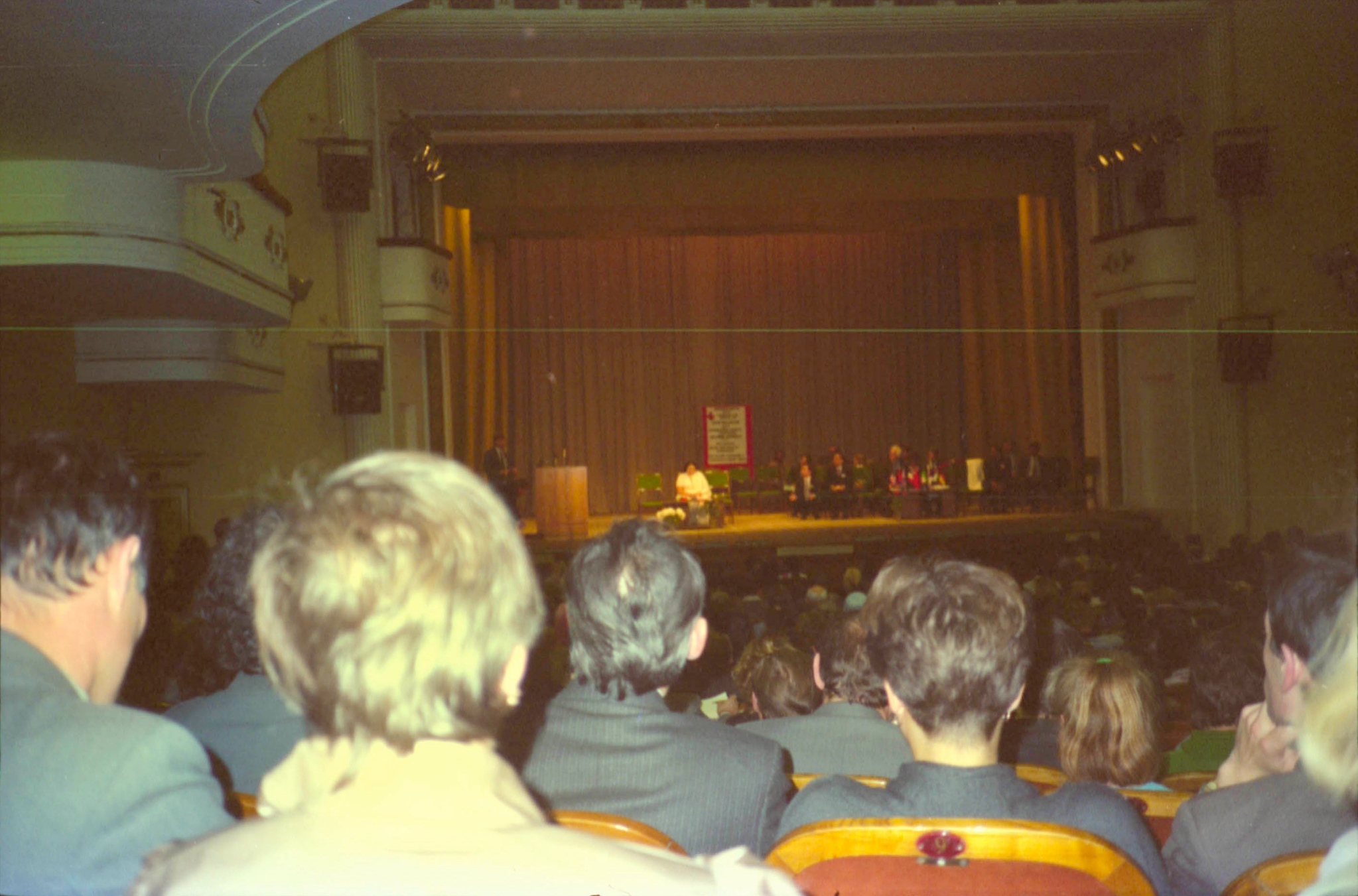 1904-0000 Public Program, Theater (white sāṛī, small green chairs, officials on the stage, curtains, lights, balcony, seekers)