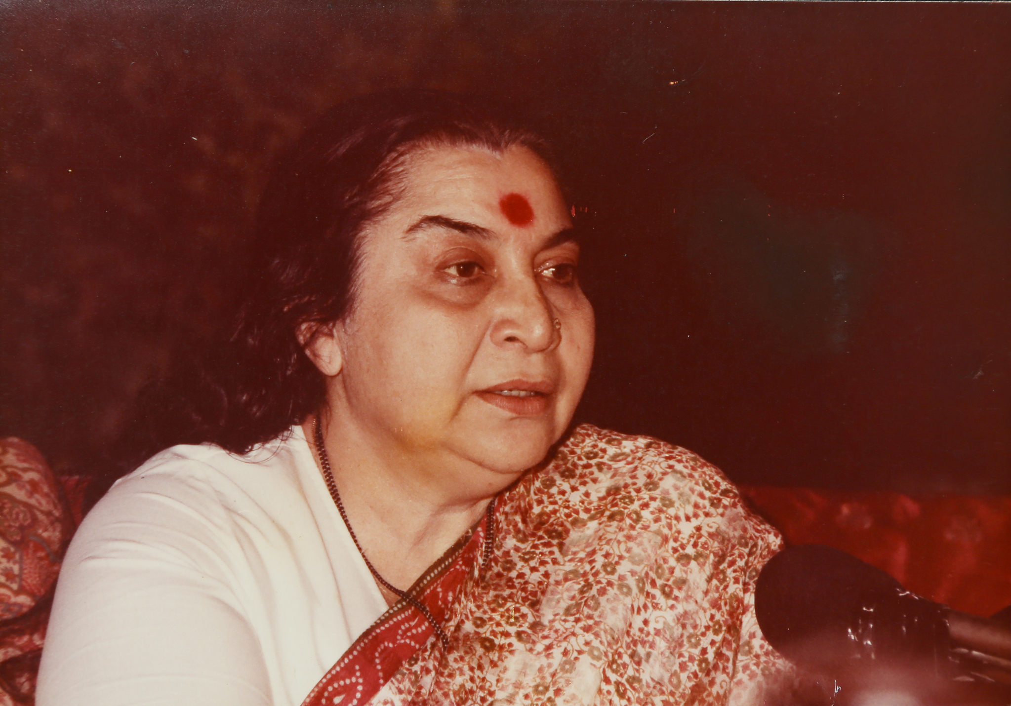 1905-0000 Talk to Sahaja Yogis (sofa, mike, white and red thin floral sāṛī, precious red stones chain, right side view)