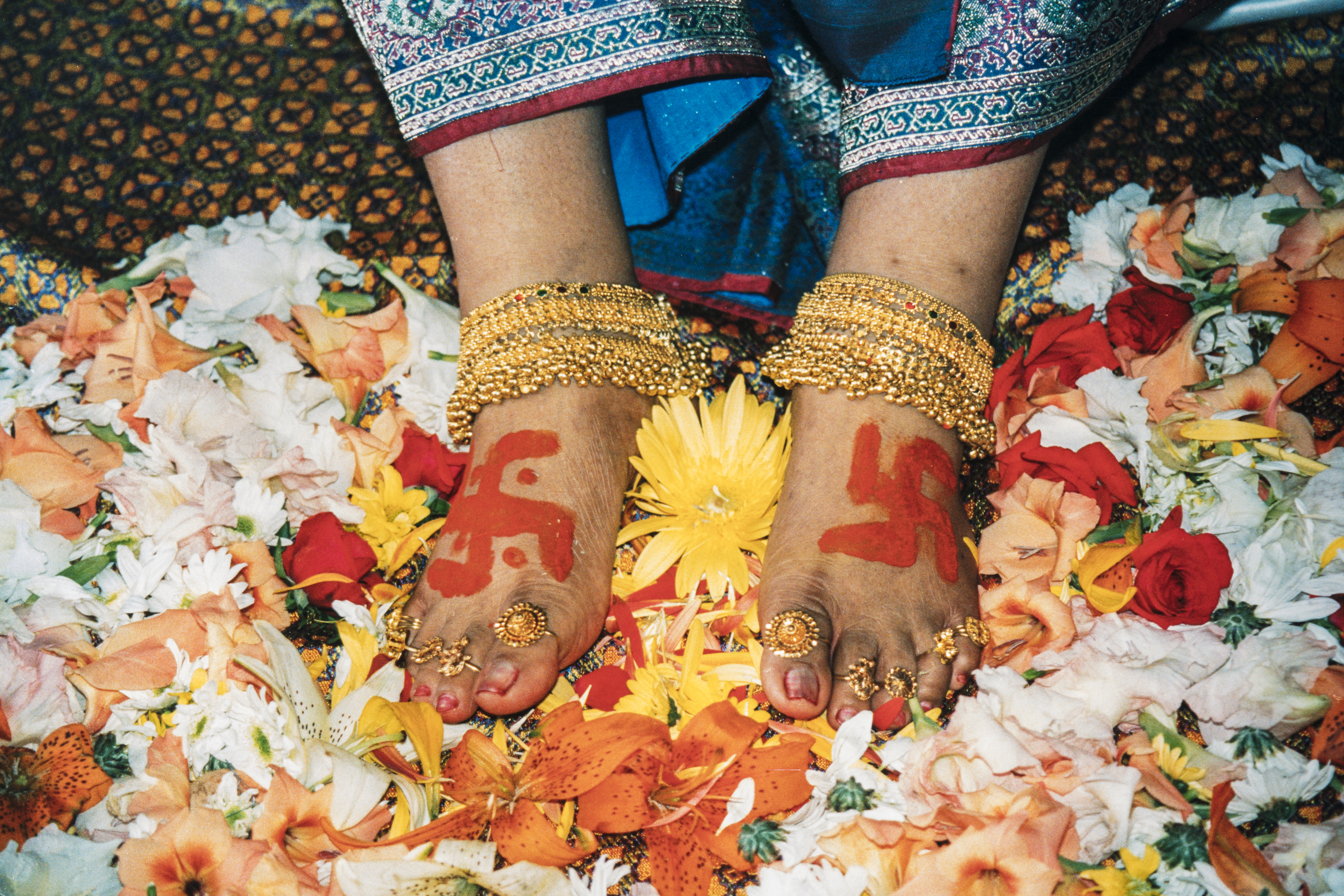 1909-0000 Lotus Feet M (blue with decorated border, Swastika with no dots on the Left Foot, yelow flower in the middle, 10 rings, carpet, orange and white flowers) less than 1 minute readTags: TBD 1909 Puja 1909-01SourcesS1. One Photo. Link to the gallery to which it was uploaded before 2023: Collection 1909. Previous Next