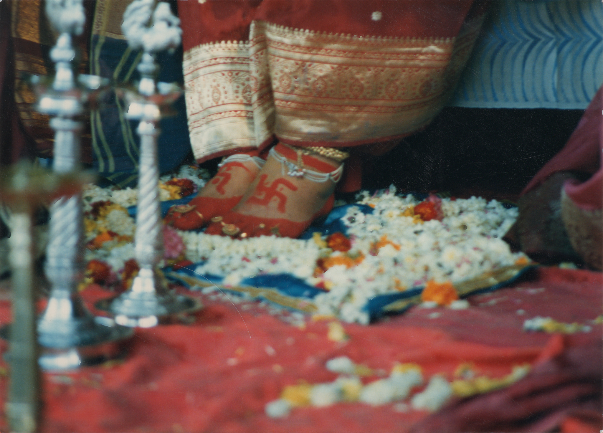 1909-0000 Lotus Feet ZB (decorated Lotus fet, red sāṛī, silver, cloth, sofa)