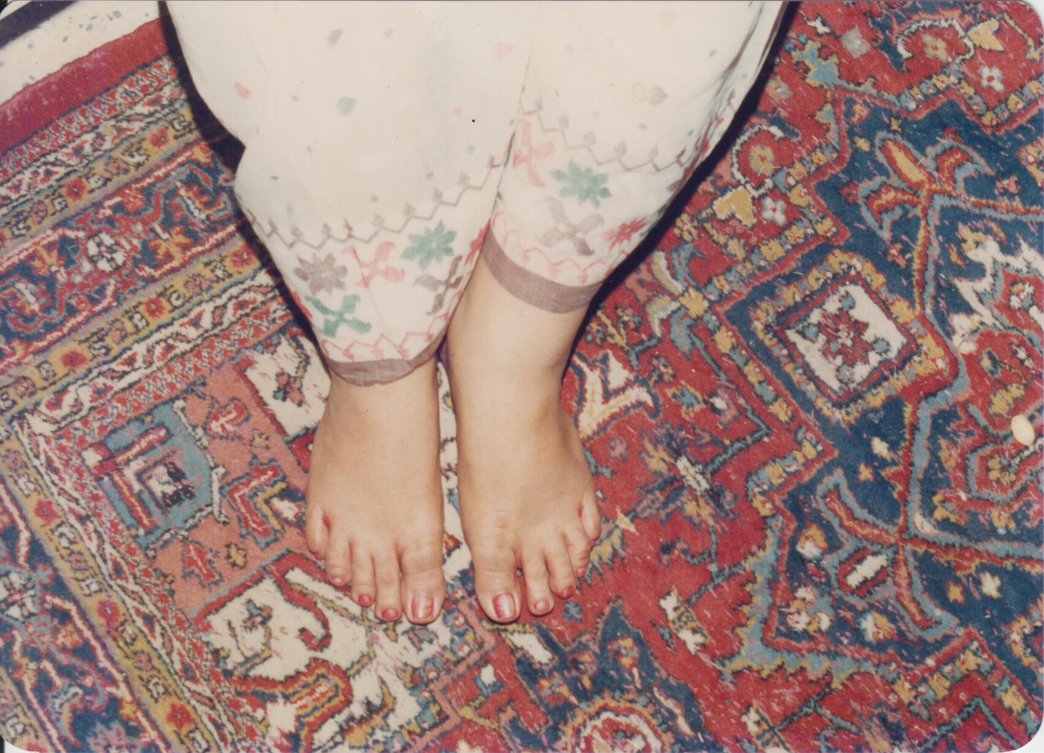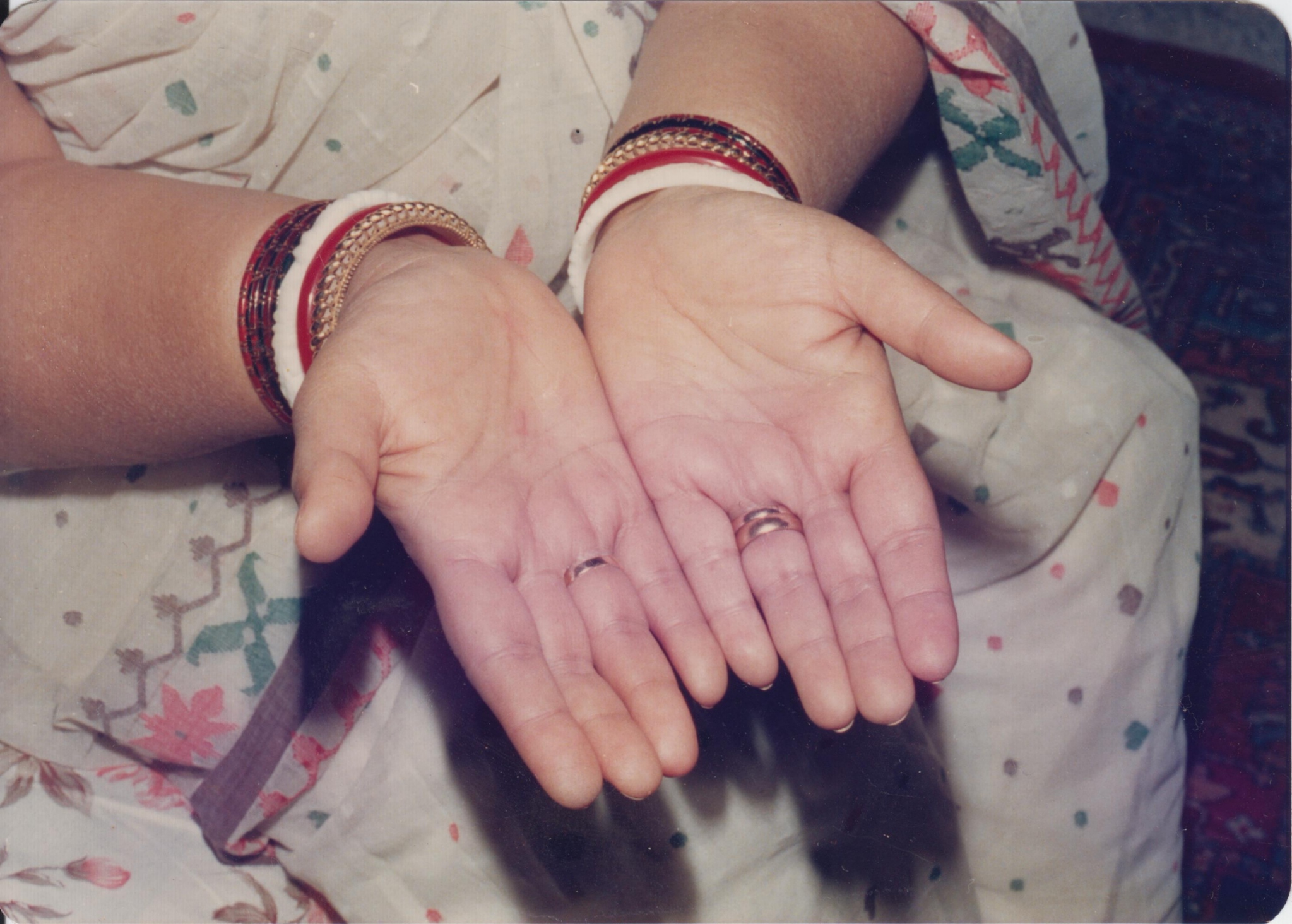 1912-0000 Series A (Lotus Feet, cotton white sāṛī with small colored decorations, carpet, hands, 3 rings, bangles)