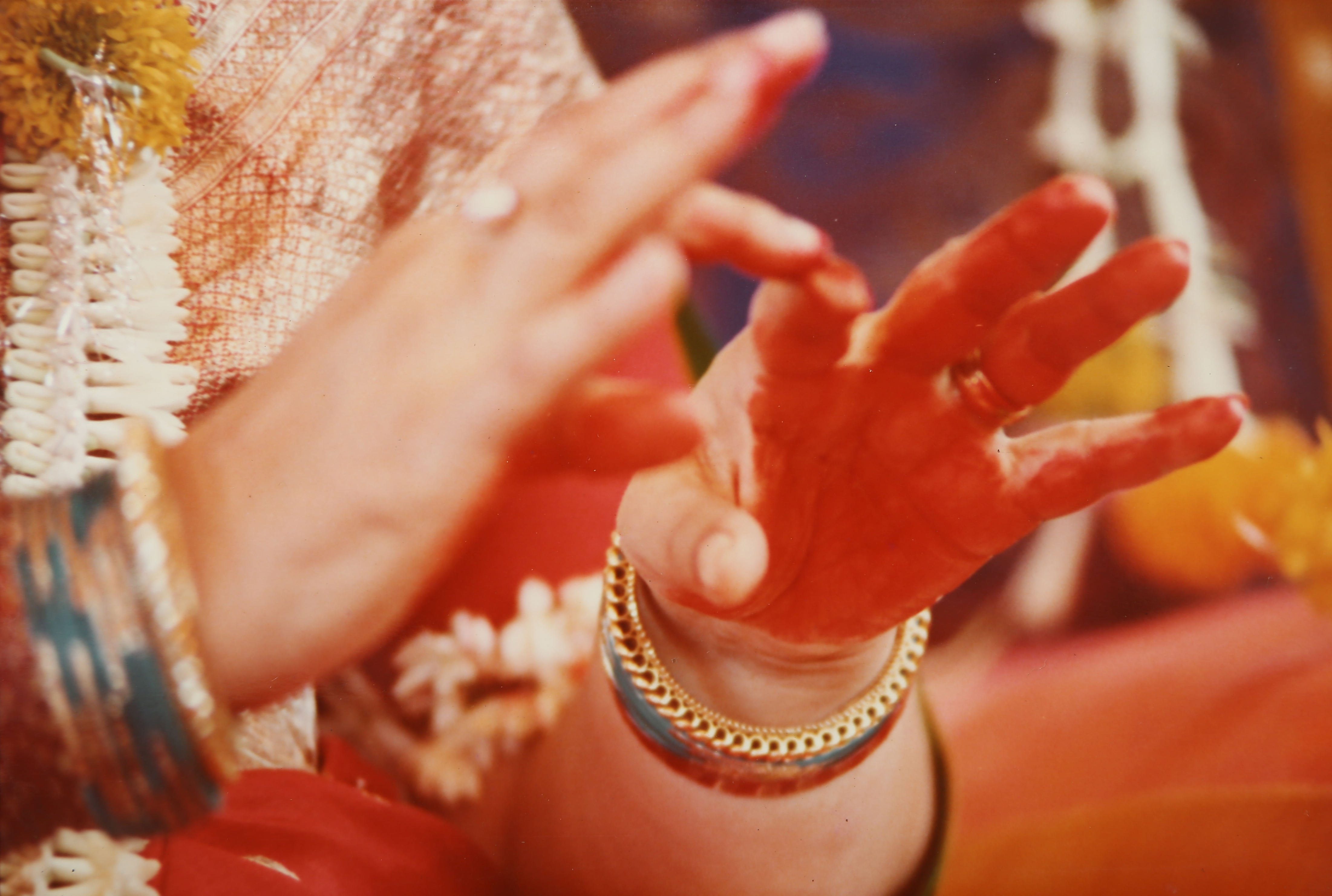 1913-0000 Pūjā (garland white with yellow, hands with multiple bangles, right middle finger ring, left ring finger ring)