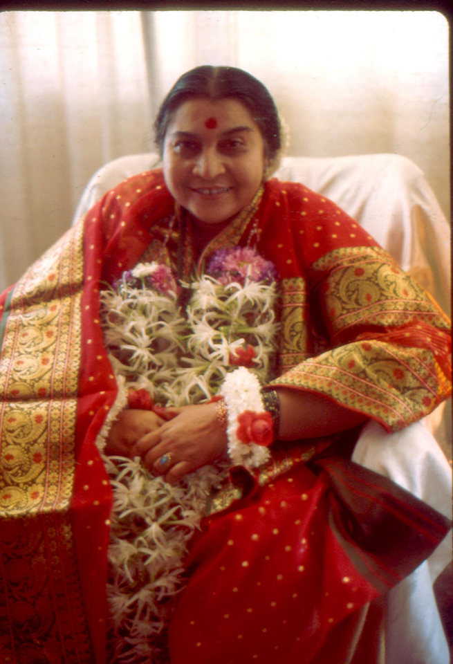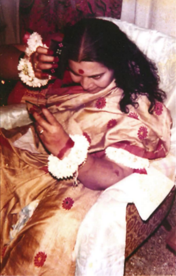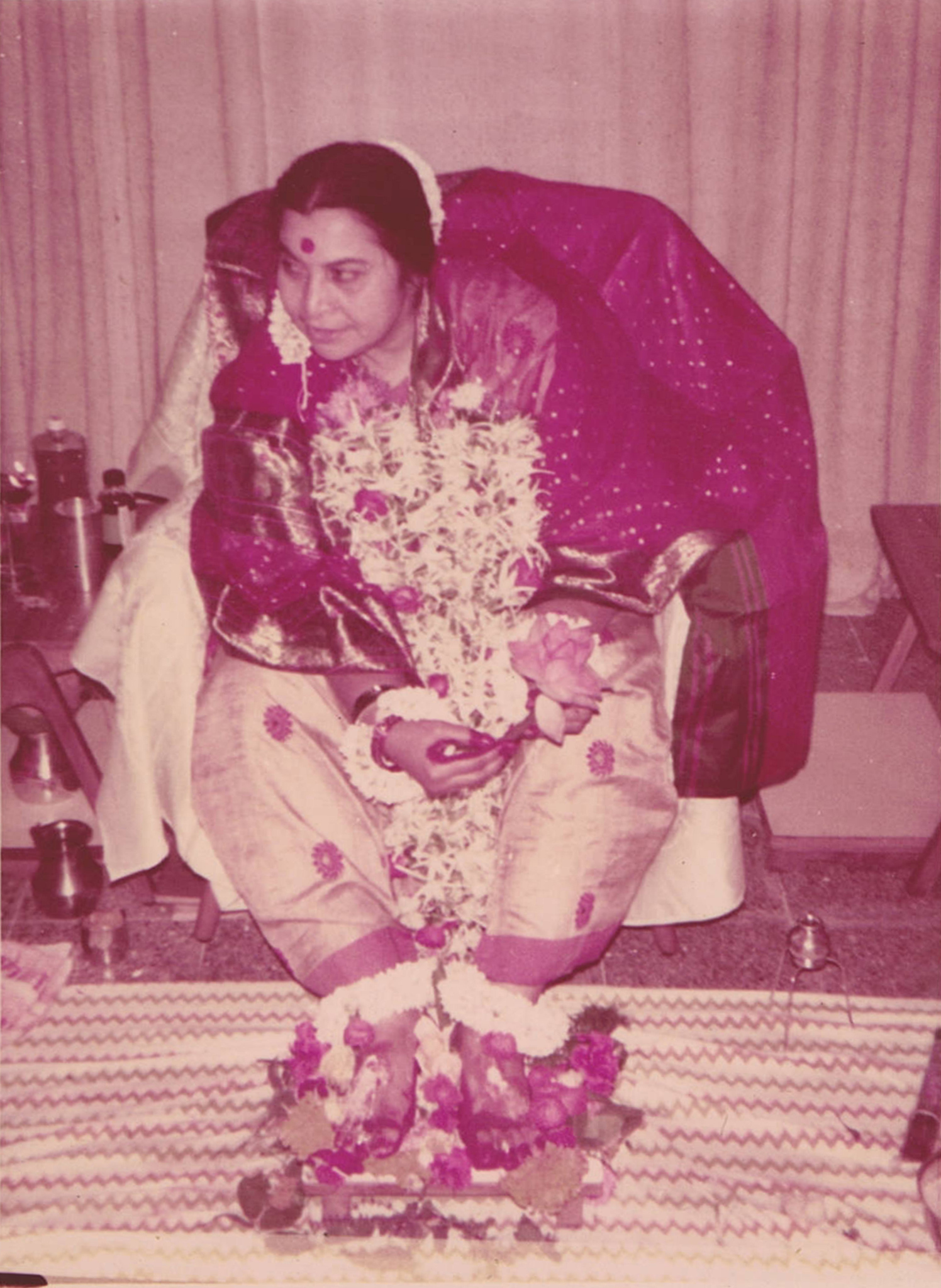 1913-0000 Pūjā (creamish sāṛī with red flowers, white garland, flowers on wrists and ankles and at the back of the head, curtain, red covering sāṛī)