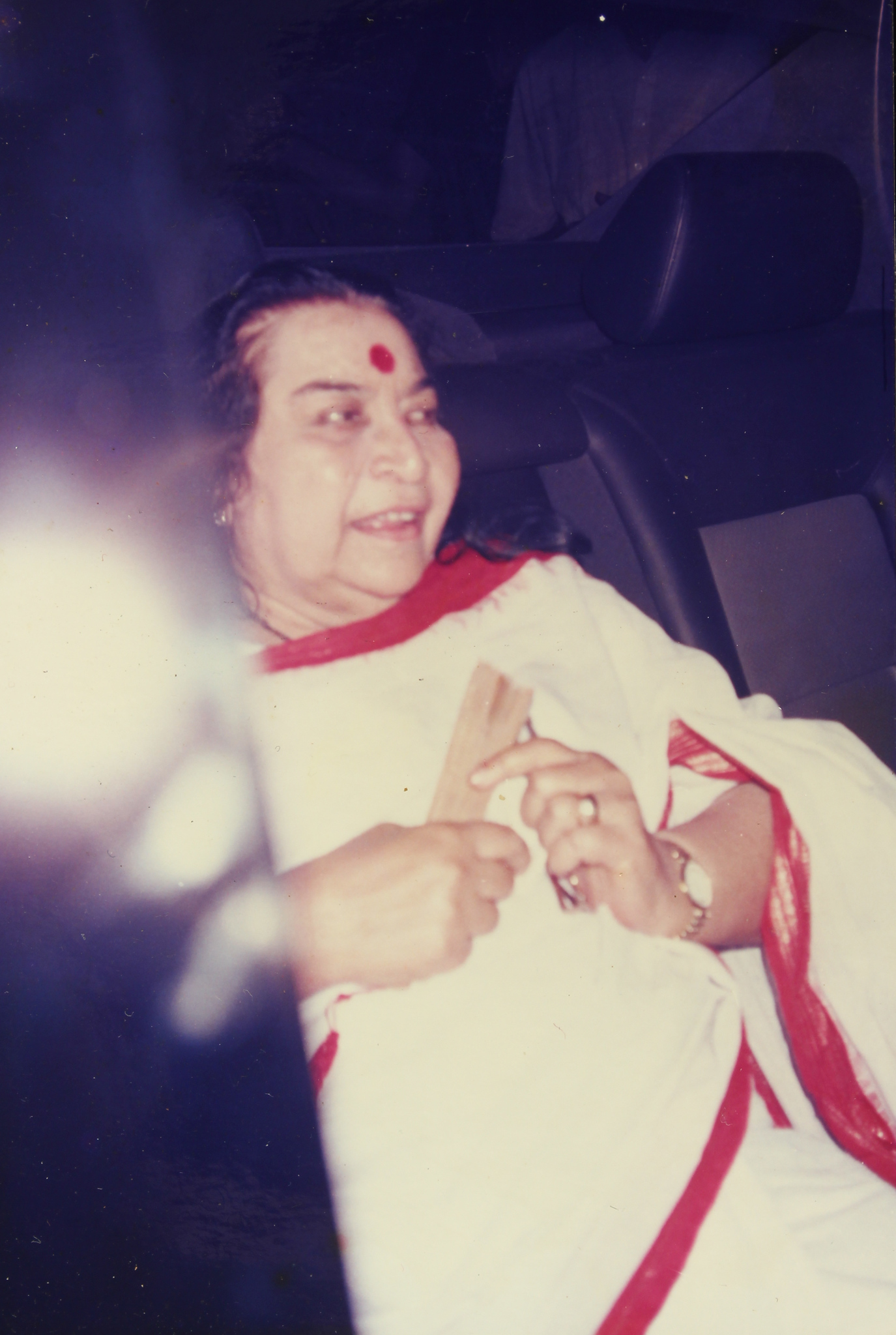 1914-0000 Right View (white sāṛī with red border, closed fan in the right hand, glasses in the left hand, sitting in a car)