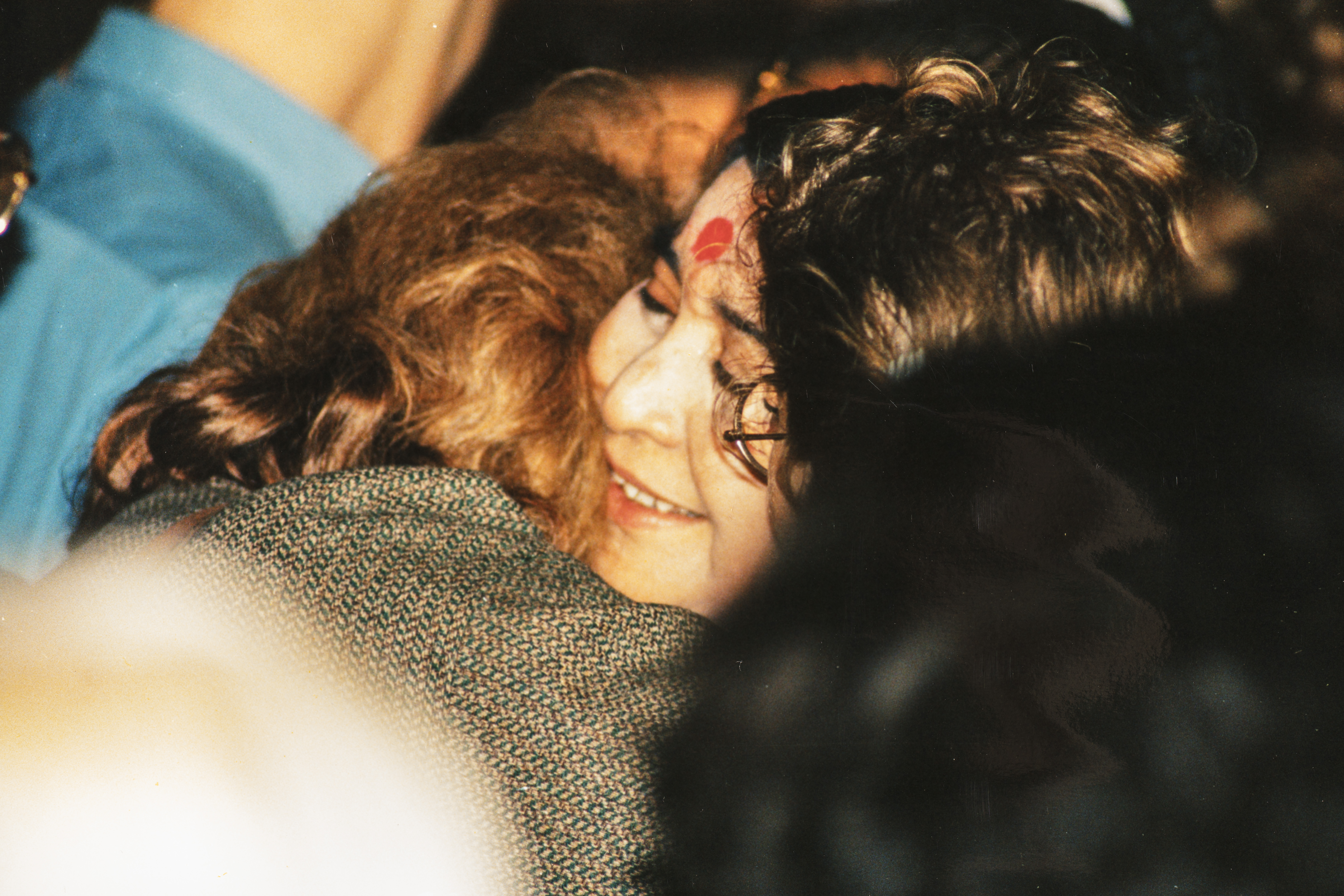 1914-0000 Left Face View (hug, crowd, Sahaja Yogi with blue shirt, lady’s special coat with green-brown pieces in rows or columns)