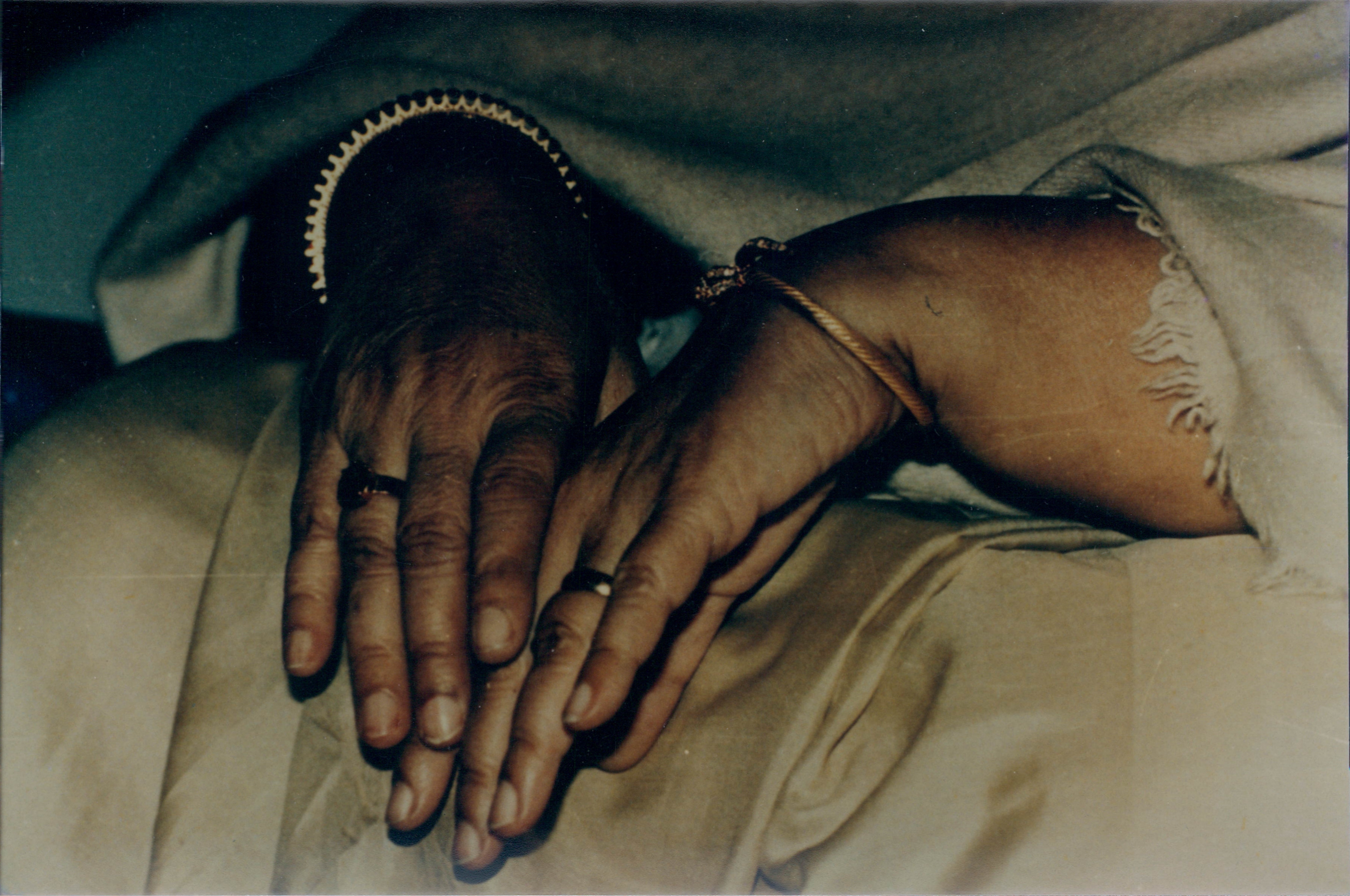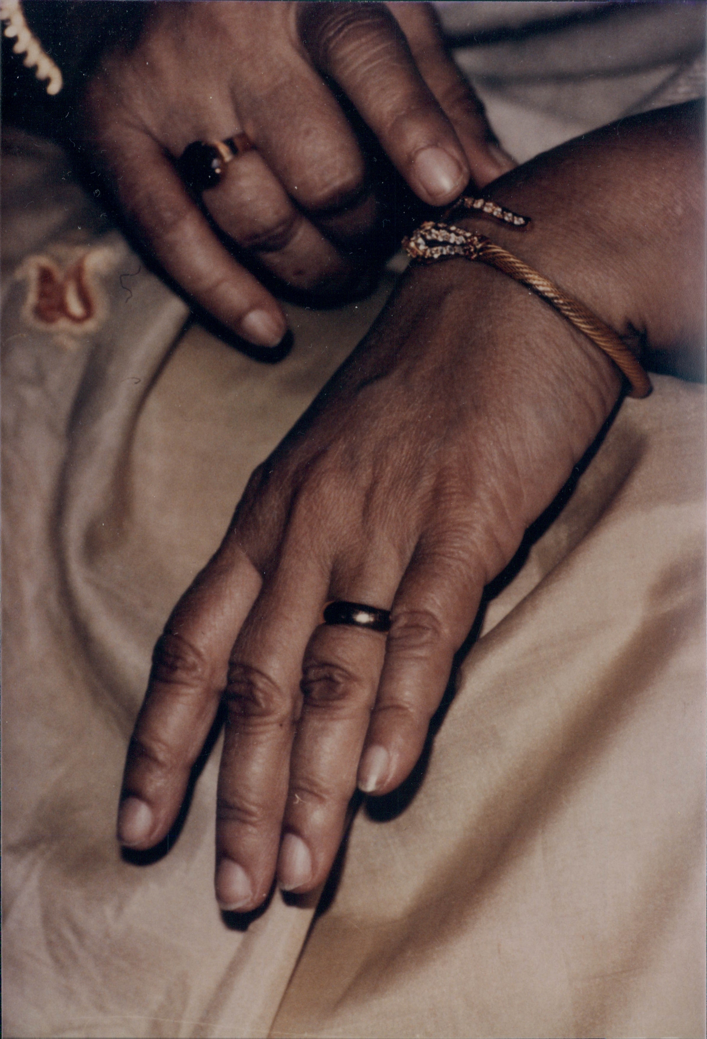 1915-0000 Hands (light brown sāṛī, rings on both ring fingers, metal left bracelet, right bangles)