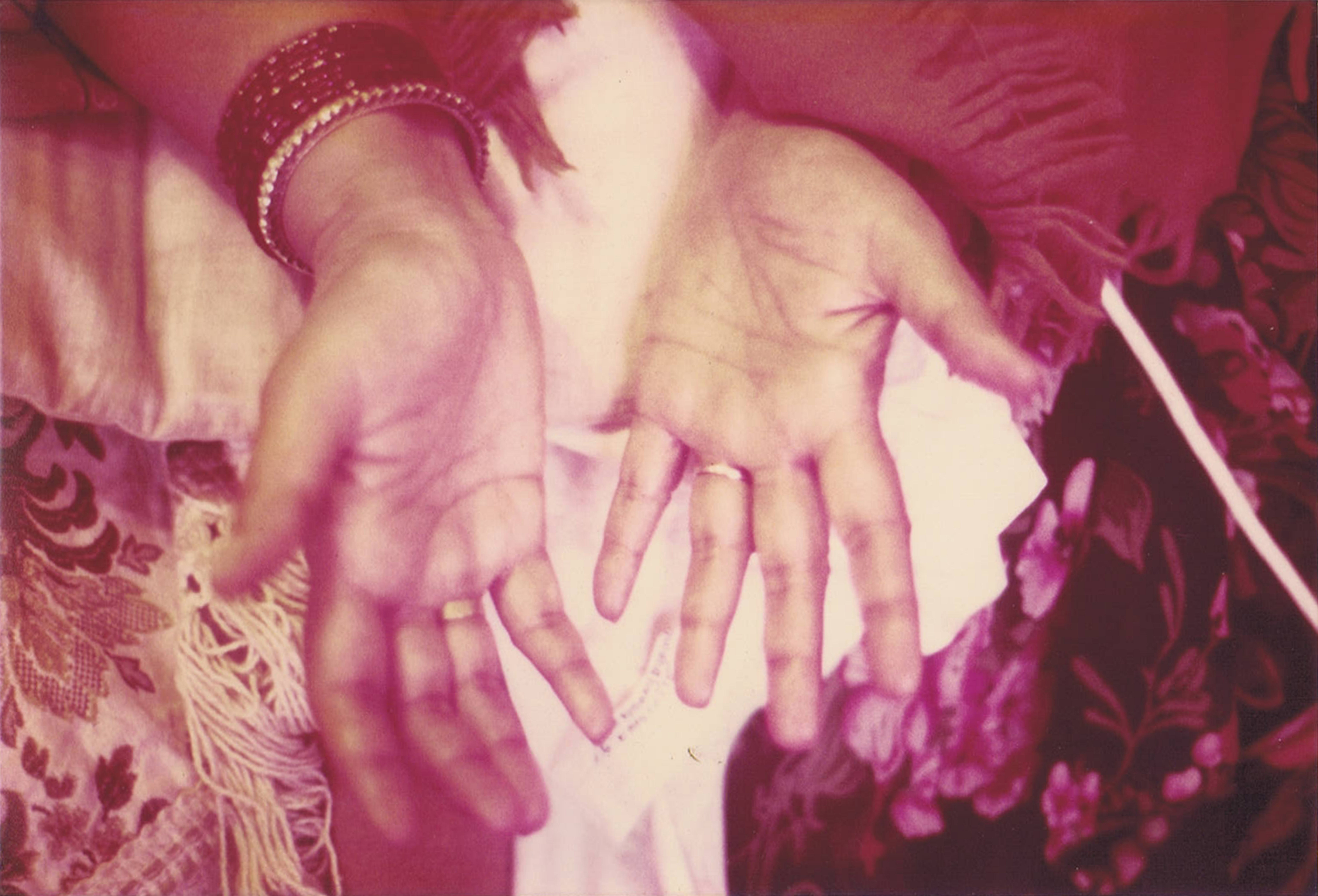 1915-0000 Open Hands Upward (two rings, red shawl, white pillow, flowers, white and dark maroon tapestry cover, many red and one golden bangles)