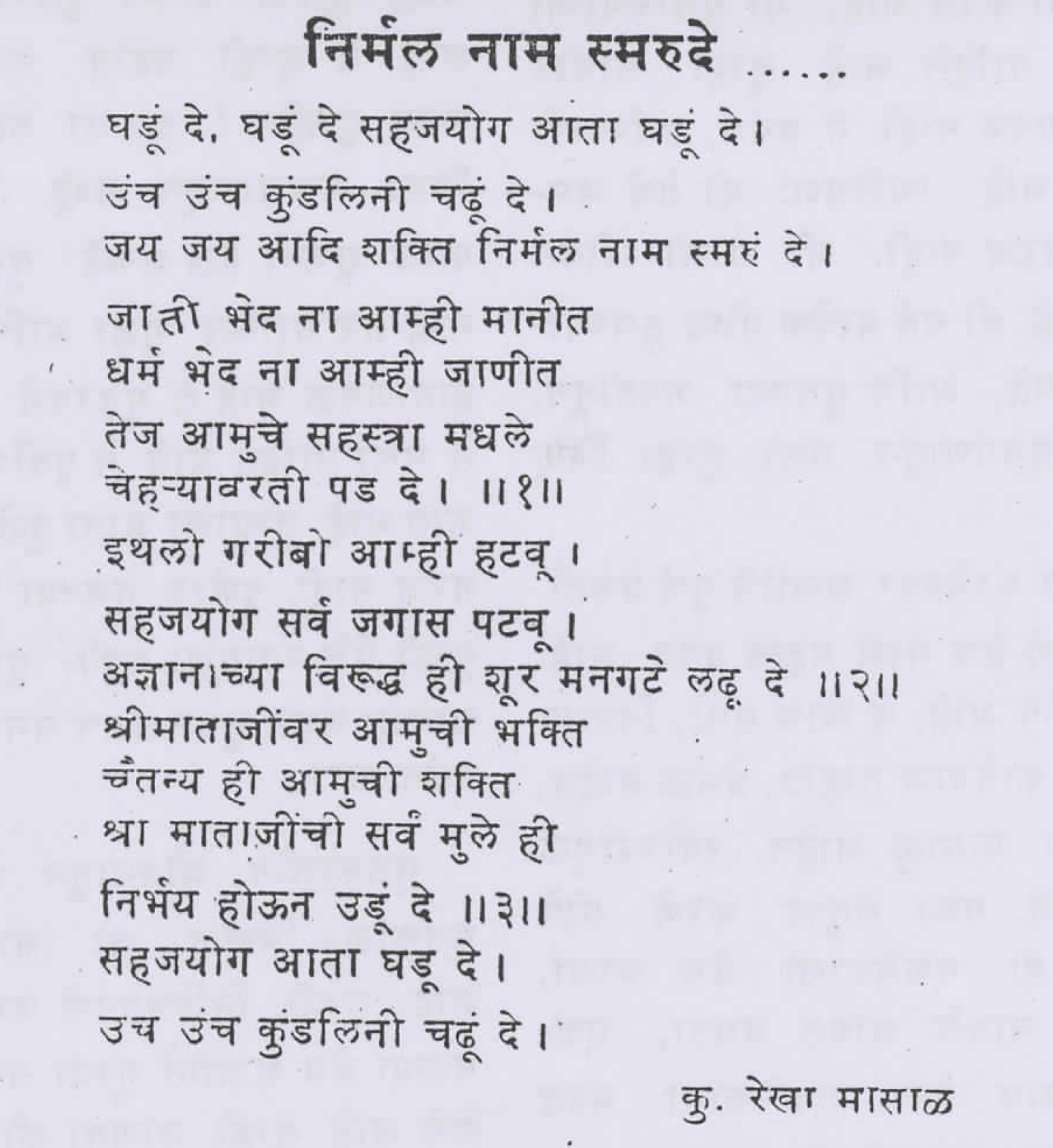 Bhajan (Marathi) ‘Nirmala Nāma Smarude (Remembering the Pure Name)’ by Rekha Masal from 1986-0101 Sahaj Yog (Marathi), Volume 1, Issue 7, Page 4, Column 2, Top