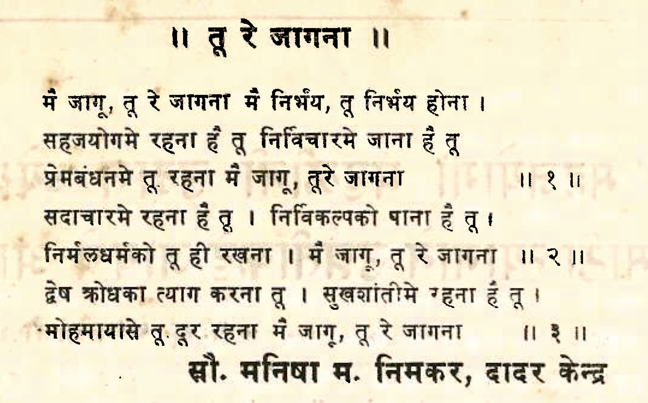 Poem (Marathi) ‘Tū re jāganā (You wake up)’ by Manisha M. Nimkar, Dadar, Maharashtra from 1986-0400 Sahaj Yog (Marathi), Volume 1, Issue 10, Page 4, Column 2, Top