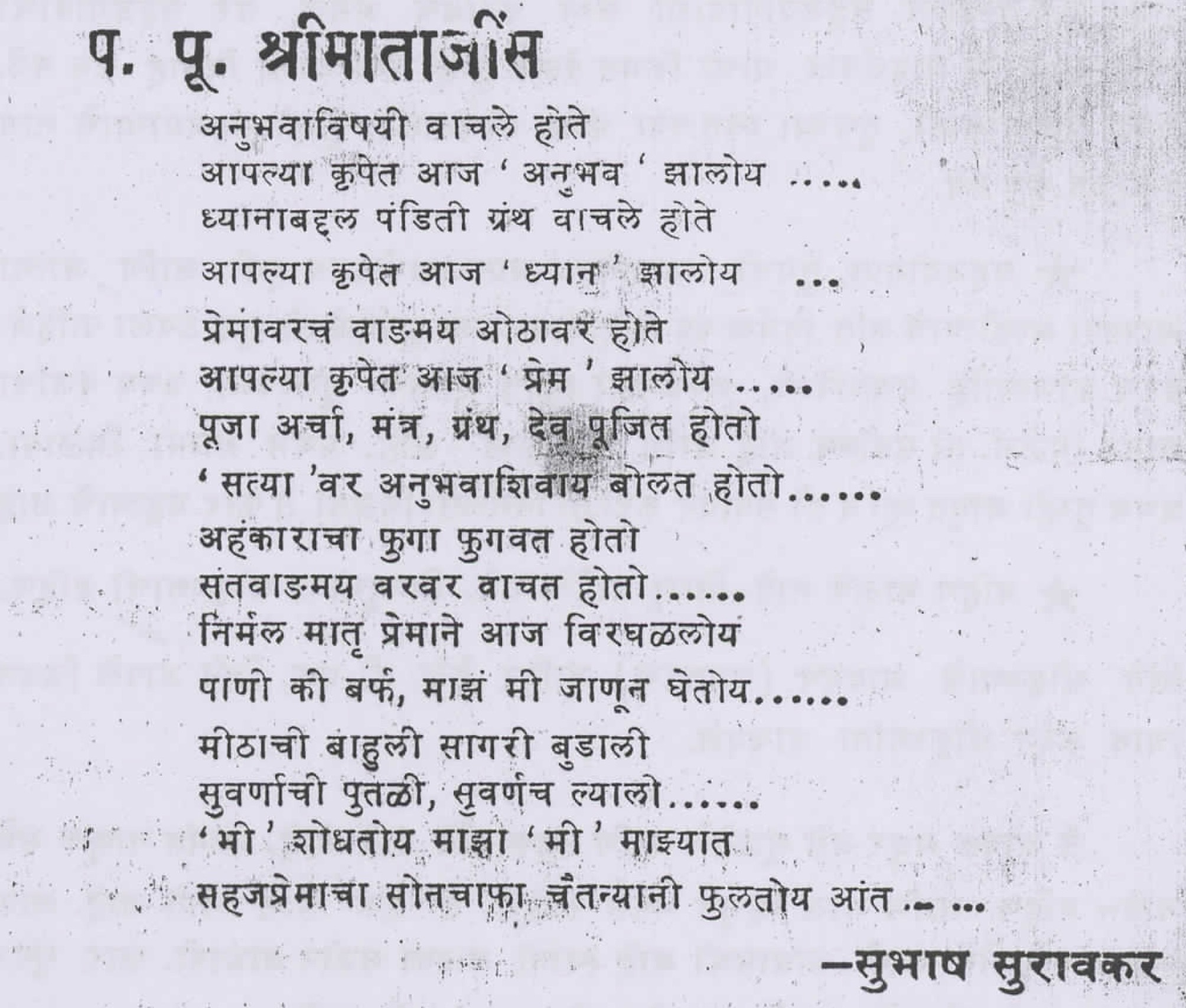 Poem (Marathi) ‘Param Pujya Shri Mataji’ by SubhashSuravkar from 1985-0801 Sahaj Yog (Marathi), Volume 1, Issue 2, Page 4, Column 3 Bottom